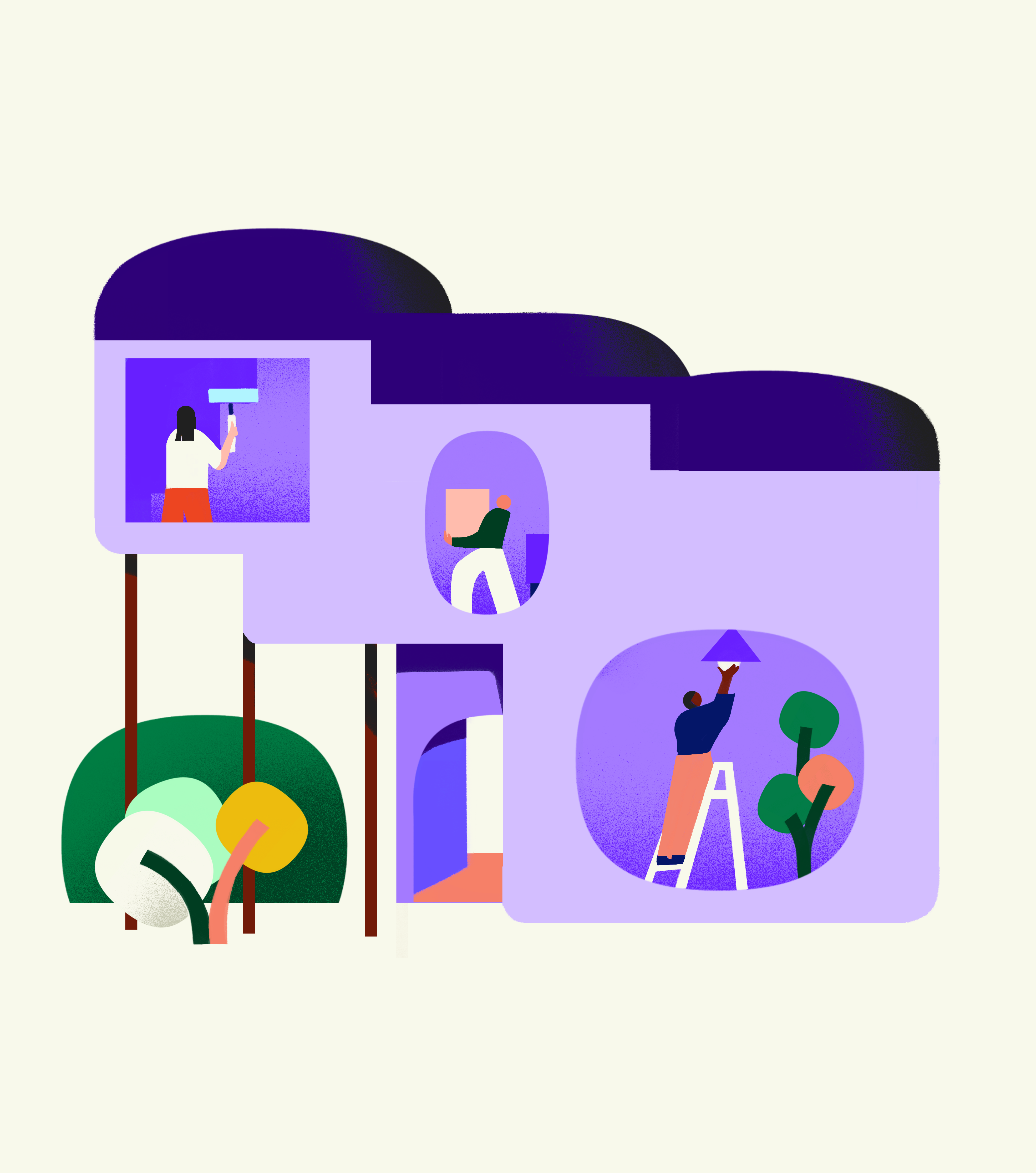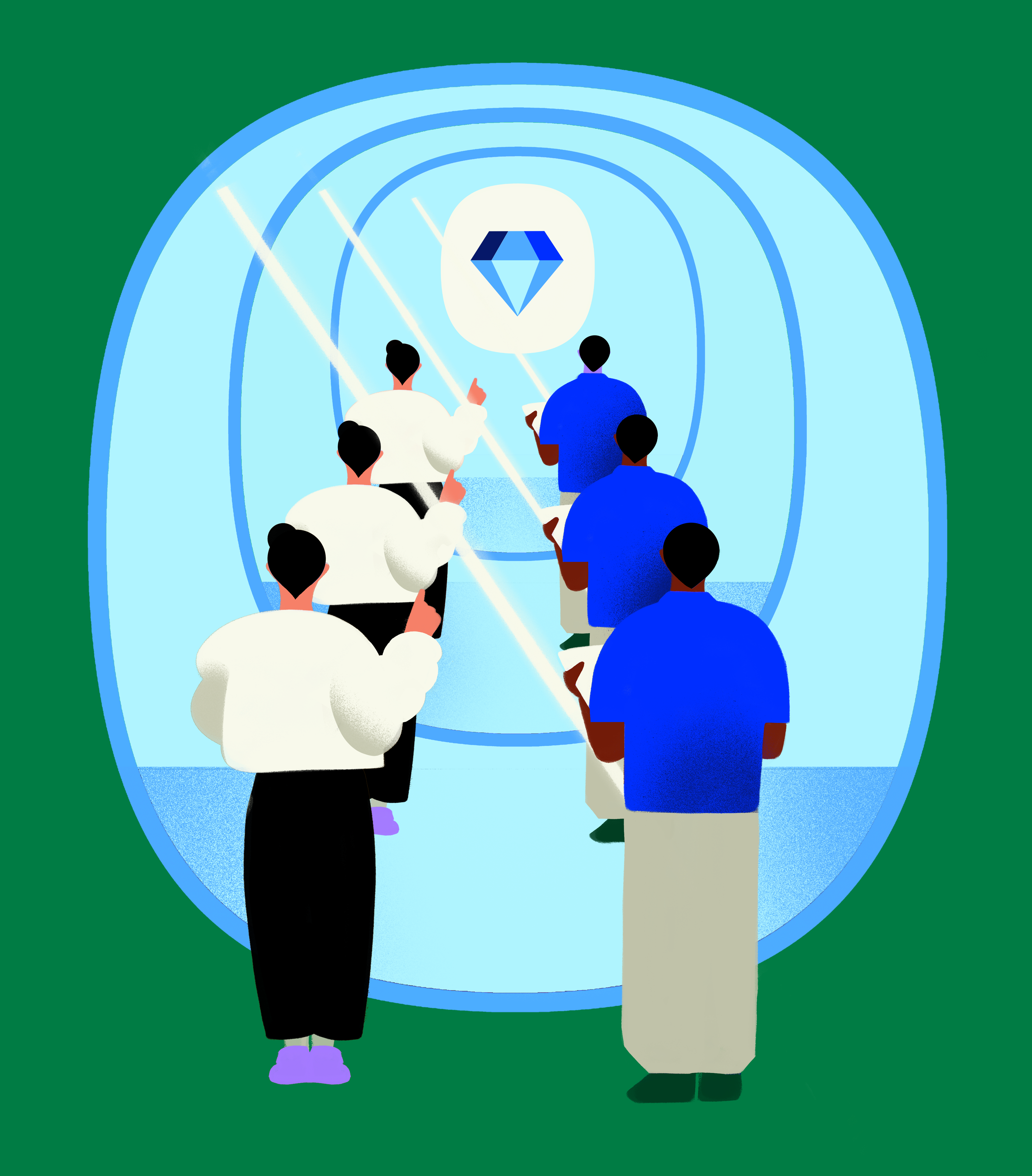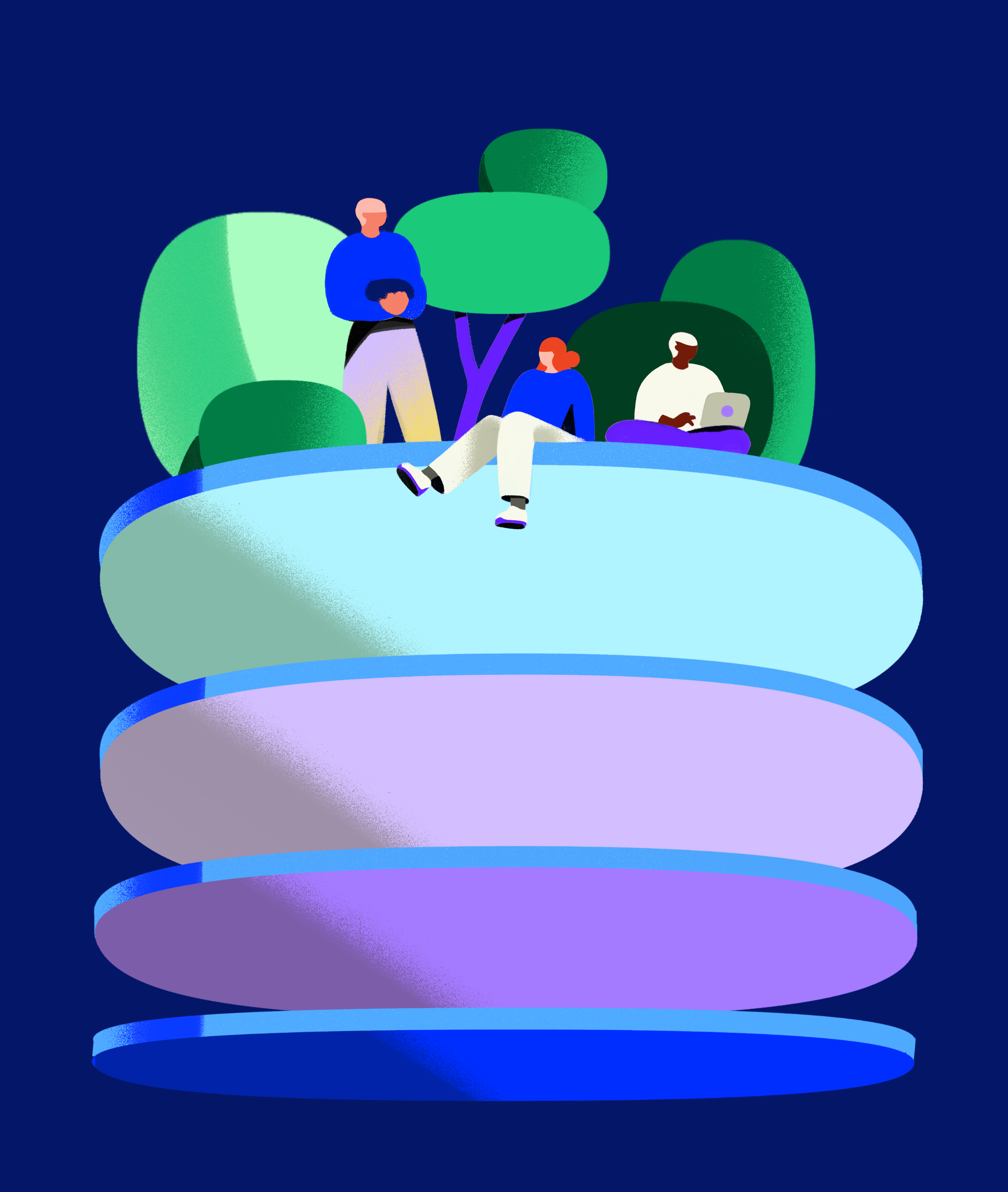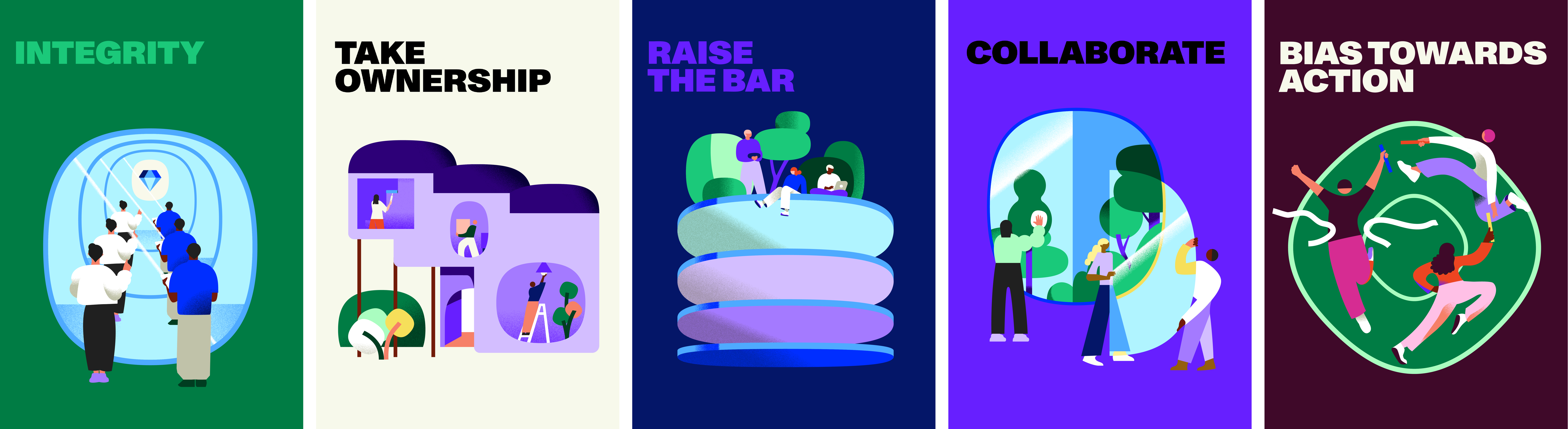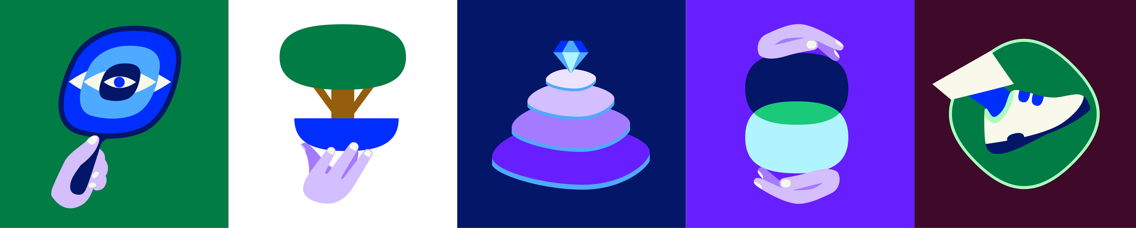 Company value illustrations with matching icons for Coda; a commerce, payments and distribution aimed at customer growth. An illustration style built on the logo's 'squircle'.